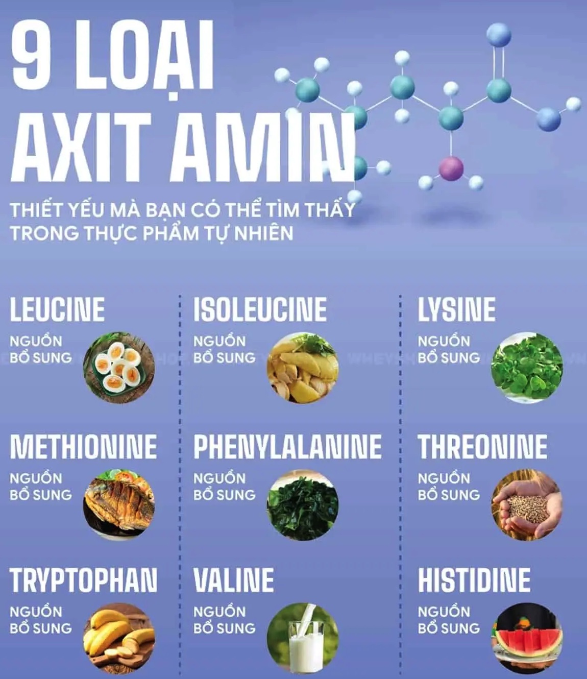 Cơ thể con người cần khoảng 20 loại axit amin để duy trì các hoạt động sống. Trong đó, có 9 axit amin thiết yếu mà cơ thể không tự tổng hợp được và cần được cung cấp từ thực phẩm, bao gồm: